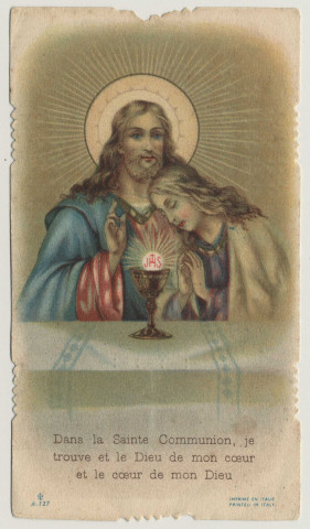 Les images pieuses sont des images de dévotion produites en masse à l'usage des fidèles. De petit format, elles sont représentées sur divers supports (papier, tissu, broderie) et imprimées en couleur ou en noir et blanc. Au dos, on trouve généralement une prière ou des litanies. Elles sont parfois personnalisées ou comportent des mentions manuscrites (date, évènement, nom et prénom de son propriétaire). Dès la fin du XIXe siècle, elles sont achetées par les fidèles en souvenir des cérémonies religieuses (baptême, communion, confirmation, funérailles, ordination).