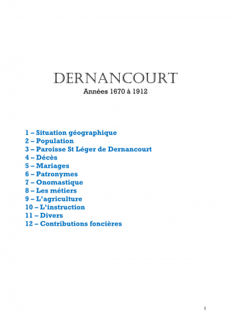 Situation géographique, population, Paroisse Saint-Léger de Dernancourt, actes de décès, actes de mariages, patronymes, onomastique, métiers, agriculture, l'instruction, divers, contributions foncières (1670-1912).