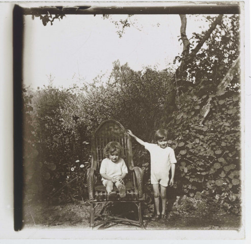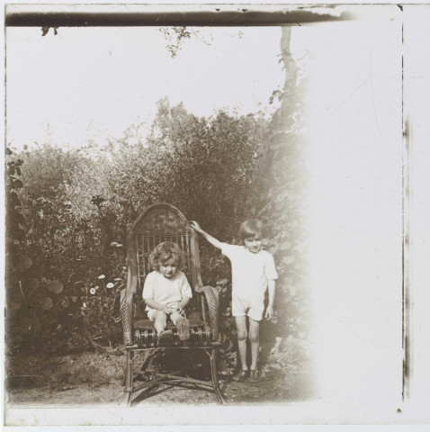 Un enfant est assis dans un fauteuil en osier et un enfant se tient debout à côté en tenant le dossier.