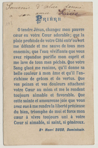 Les images pieuses sont des images de dévotion produites en masse à l'usage des fidèles. De petit format, elles sont représentées sur divers supports (papier, tissu, broderie) et imprimées en couleur ou en noir et blanc. Au dos, on trouve généralement une prière ou des litanies. Elles sont parfois personnalisées ou comportent des mentions manuscrites (date, évènement, nom et prénom de son propriétaire). Dès la fin du XIXe siècle, elles sont achetées par les fidèles en souvenir des cérémonies religieuses (baptême, communion, confirmation, funérailles, ordination).